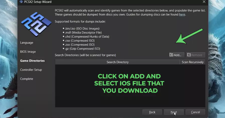 Once the BIOS is configured, the wizard will prompt you to set up a game directory. Browse and select the folder containing your PS2 game ISOs.