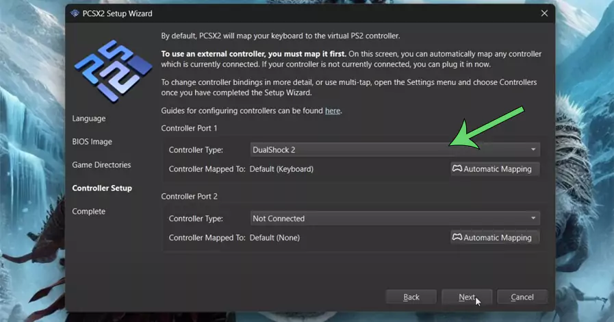 The next step is to configure your controller settings. Click on the Configure option under Controller Settings to set up your keyboard or any connected game controller. PCSX2 provides easy-to-follow options to map buttons and ensure smooth gameplay. Once the controller is configured, continue through the wizard until you reach the final screen, then click Finish to complete the setup process.
